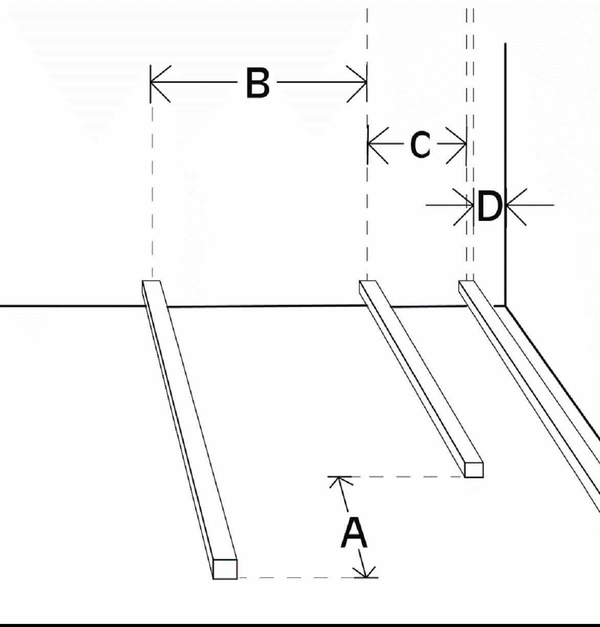 I listelli devono essere asciutti, dritti e senza curvature o torsioni. I listelli devono essere distanziati a intervalli regolari. I centri dei listelli, B e C, sono determinati in base all'uso del pavimento, ai carichi previsti e al tipo di pavimento (plancia da 20,5 mm o 2-strip da 22 mm):