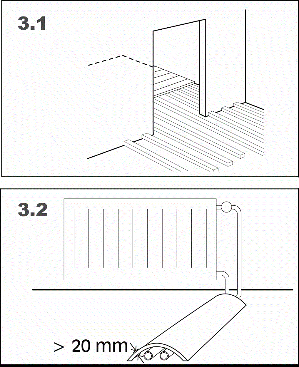 Tutti i tubi del riscaldamento centrale e dell'acqua calda e fredda sotto i pavimenti devono essere accuratamente isolati utilizzando almeno 20 mm di lana minerale o simile.