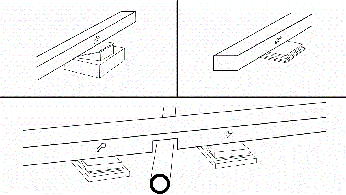 Inchiodatura ai travetti: il sistema di travetti è costituito da travi intere (sezioni trasversali quadrate o approssimativamente quadrate) di almeno 100 x 100 mm, travetti in legno o in compensato, e viene utilizzato sopra gli spazi di ventilazione e le cantine o come strutture del pavimento.