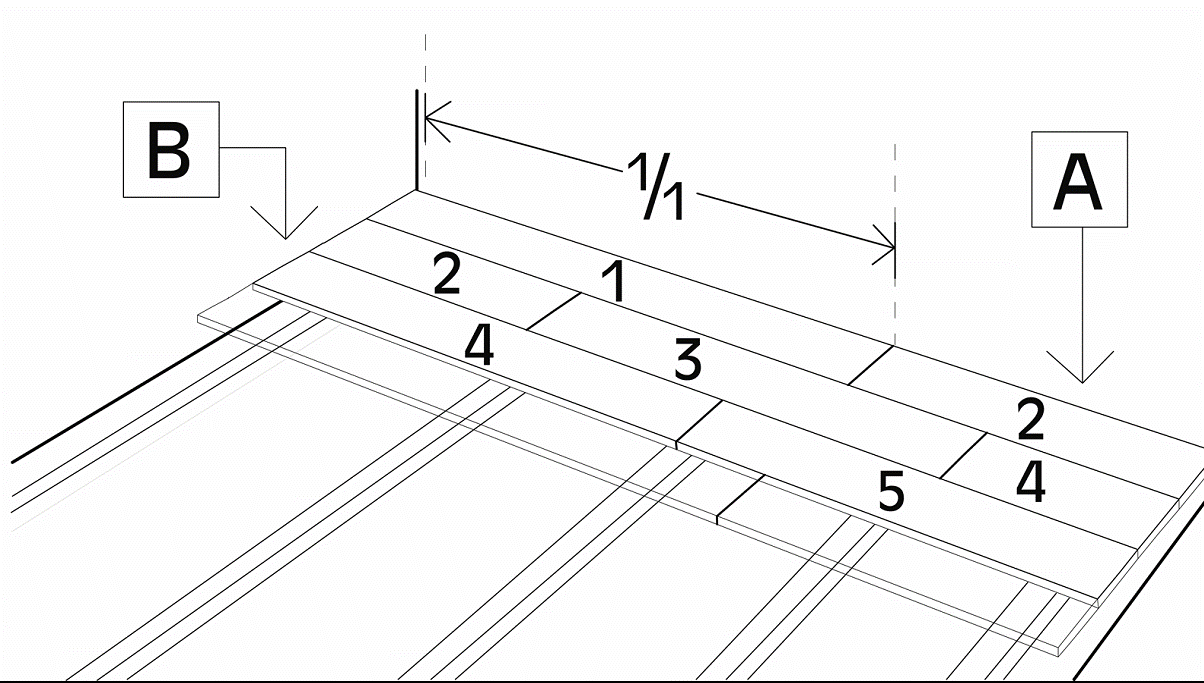 Posare le assi del pavimento con giunti disposti in modo casuale. Distribuire i giunti delle testate il più lontano possibile l'uno dall'altro. Tuttavia, la distanza tra i giunti delle assi del pavimento in due file successive deve essere di almeno 250 mm. I giunti delle estremità delle assi possono trovarsi tra i listelli, ma non più di una volta ogni tre assi.