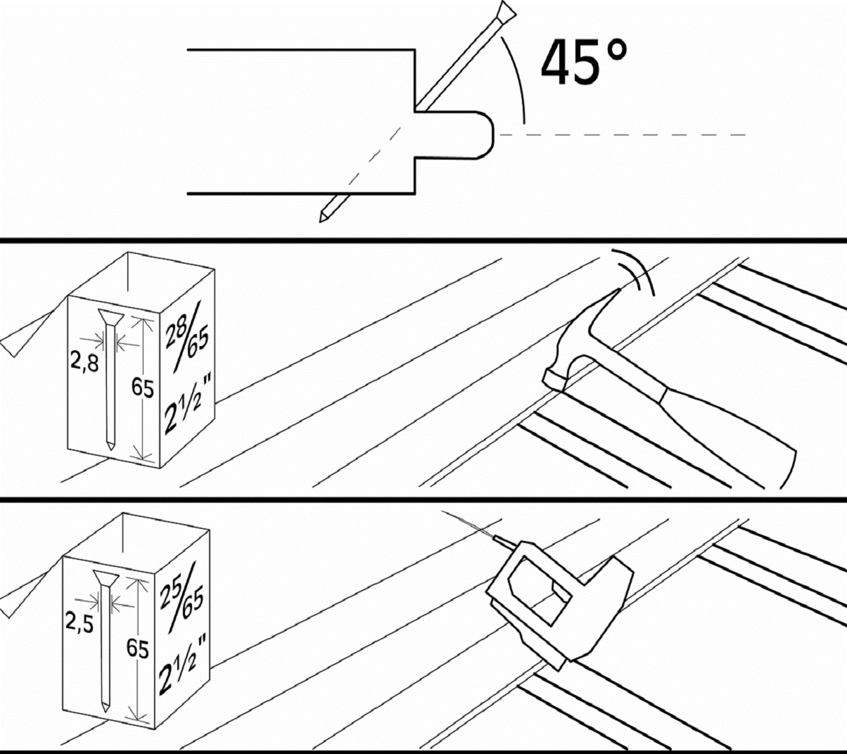 Le tavole del pavimento devono essere chiodate in modo nascosto con un angolo di 45° con un chiodo in ogni tavola, in ogni listello/travetto