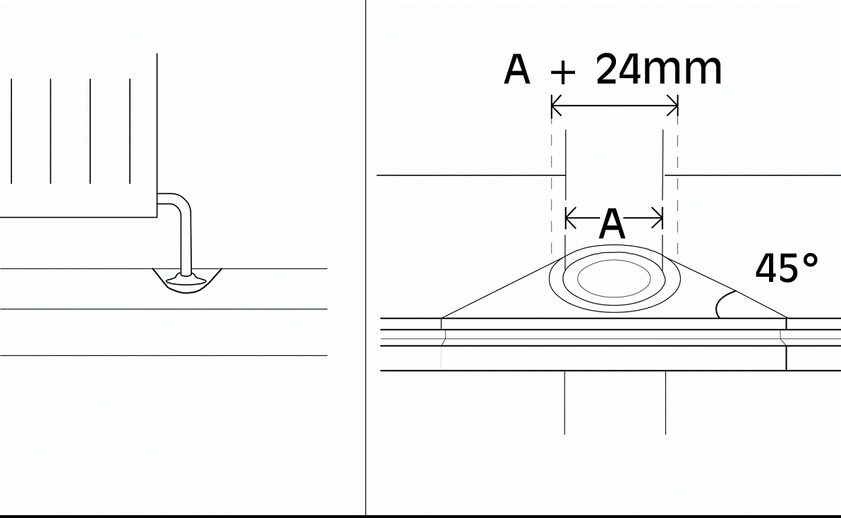 Intorno ai tubi, praticare un foro nel pavimento per far passare il tubo. Lo spazio intorno al tubo deve essere uguale allo spazio di dilatazione sulla parete. Tagliare un cuneo rastremato in modo da poterlo incollare in posizione. Questo spazio viene coperto con un copri tubo per radiatori.