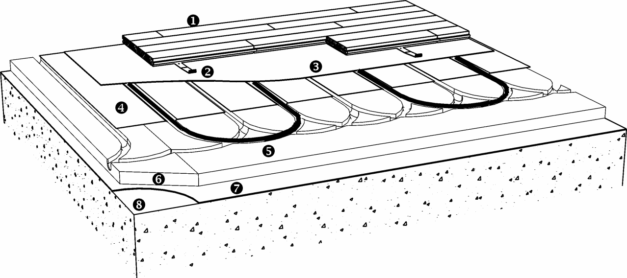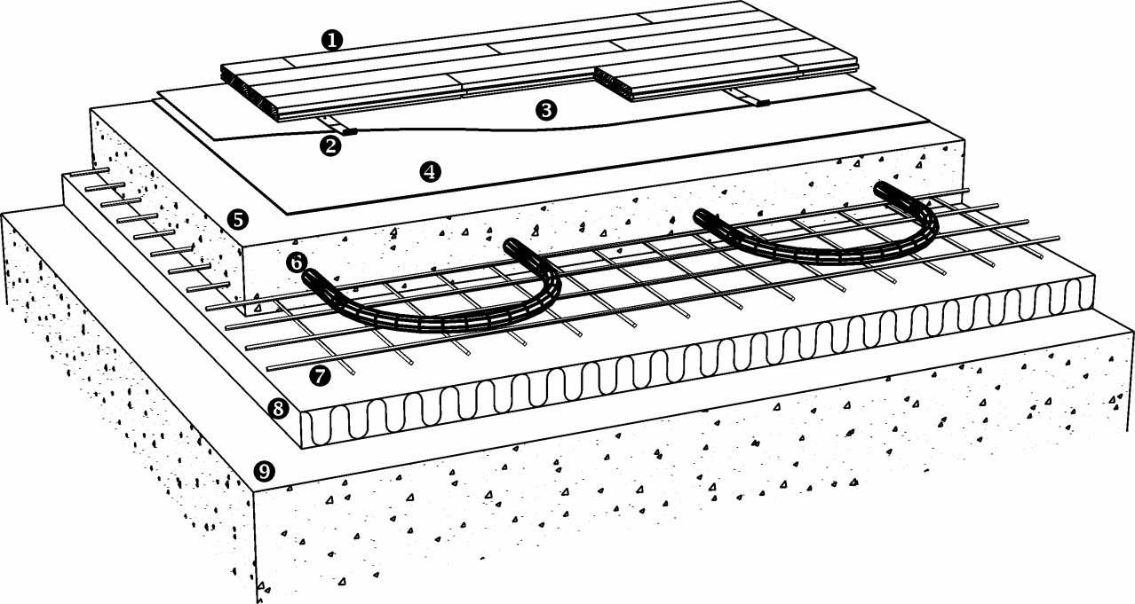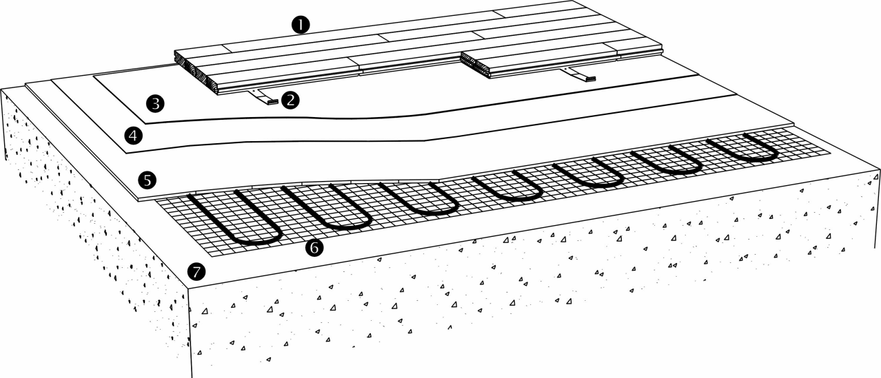 Il Sistema a Clips può essere posato su un massetto livellato con tubi o cavi di riscaldamento incorporati. È estremamente importante che il sistema di riscaldamento del pavimento sia progettato per ottenere una temperatura stabile sull'intera superficie in calcestruzzo o massetto livellato. Le seguenti indicazioni riguardano i tubi di riscaldamento incorporati in massetti in calcestruzzo o massetti livellati.
